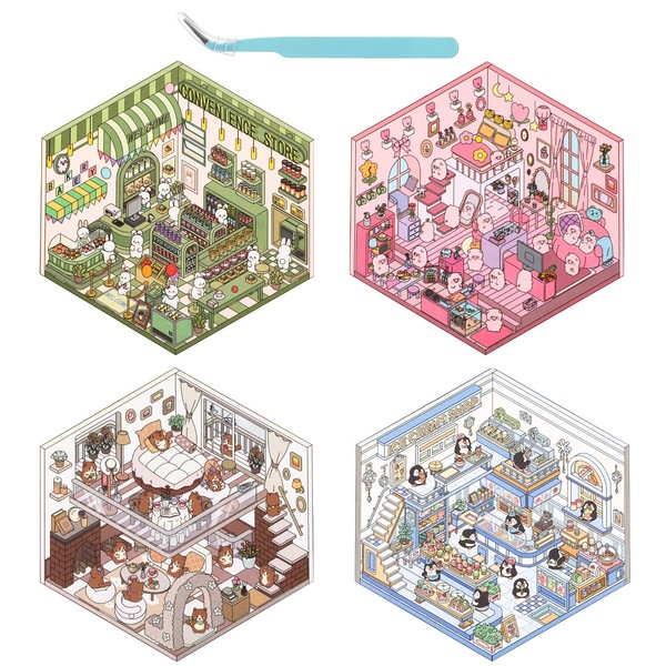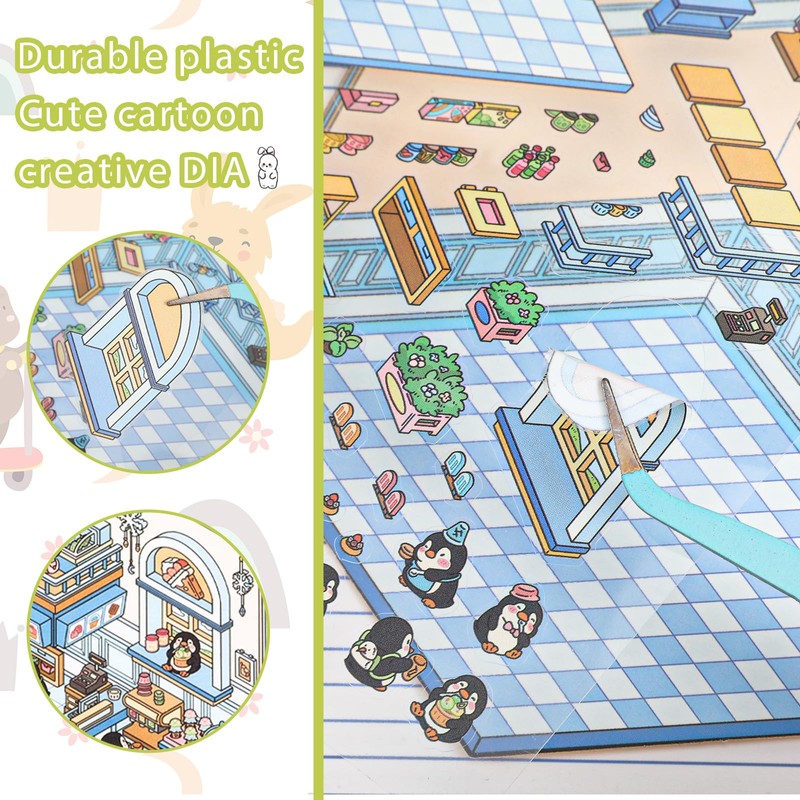 - Creative 3D sticker scene: house sticker set gives two creative combinations, one set has 4 scene sets + 1 tweezers to keep stickers free of wrinkles and fingerprints. Combination A: Christmas style sushi restaurant (brown, cat), bamboo bookstore (green, panda), cocoa cafe (brown, puppy), fresh bedroom (blue, puppy). Combination B: ice cream supermarket (blue, penguin), semi-detached house (brown, cat), warm bedroom (pink, piglet), supermarket (green, rabbit)