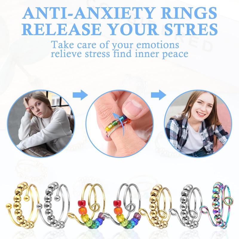 - Cool and stylish: You will receive 7 different styles of fidget toys, including 4 solid color rings (2 gold rings, 2 silver rings) and 3 colorful rings. Curly openings or bead-embellished rings are full of personality and coolness. No matter what the occasion is, these anxiety relief items are sure to be well received: Anniversary, wedding, gift, party, casual, dating.