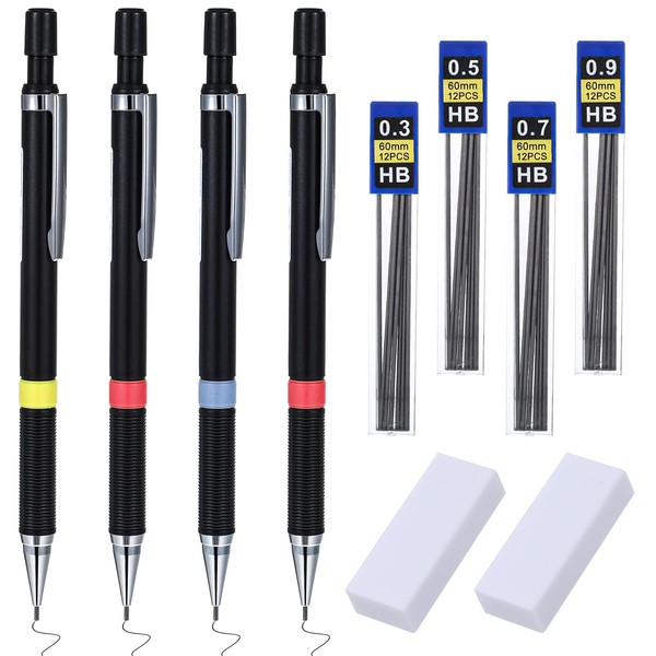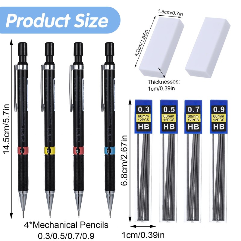 - Mechanical pencil set in different thicknesses: the writing set consists of a total of ten pieces and offers you a comprehensive range of writing utensils. Office materials include 2 erasers, one each for mechanical pencils 0.3 / 0.5 / 0.7 / 0.9 mm and 4 boxes of pencil leads. The specifications of the pencil lead are also 4 thicknesses, each one box, there are 12 sticks per box. You can choose different refill sizes depending on the purpose.