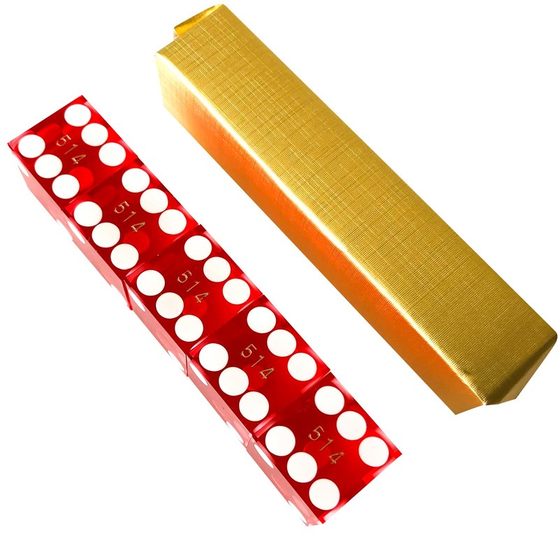 - The casino dice are made from high-quality acrylic material with glossy,polished finish. The spots on their faces are made flush to ensure there is no imbalance on the dice.The precision quality transparent casino serialized dice dimensions are 19x19x19mm and are accurate to .0001.The razor's edges ensures trully random rolls. 5pcs red casino dices per set and wrapped with gold foil.Each set is professionally serialized to prevent tampering.