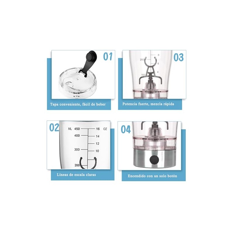 - Características: Hecho de plástico de grado alimenticio y material de acero inoxidable, sin BPA, seguro, inodoro y duradero. Simplemente presiona el botón de la base para mezclar automáticamente, fácil de usar. Diseño de revestimiento múltiple a prueba de fugas y completamente sellado, sin fugas, incluso lo vuelves boca abajo. Cuerpo transparente con impresión a escala transparente. Base desmontable, fácil de levantar. Tamaño ligero y compacto, fácil de llevar, ideal para el hogar, gimnasio, oficina, viajes, etc. Especificaciones: Color: como se muestra. Material: acero inoxidable + plástico de grado alimentario. Tamaño del producto: 8 x 8 x 20 cm. 1 x 3. 1 x 7. 9 pulgadas. Capacidad: 450 ml. Velocidad: 7000r/ min Resistencia a la temperatura: