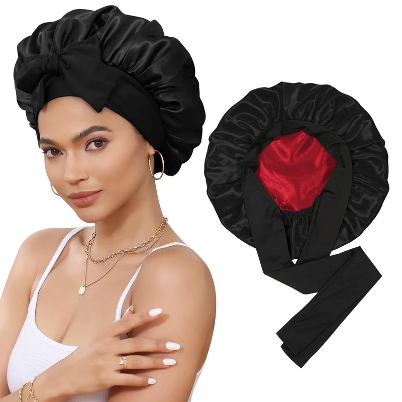 YueJieSelected Silk Bonnet Sleep Cap, Silk Bonnet Sleep Cap, Silk Satin Hair Cap for Night, Sleep Cap Hair Protect Cap Silk Hood for Sleeping (1 Light Powder), black red, 58