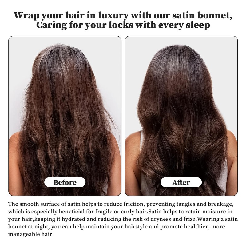 • High Quality Materials This silk bonnet for sleeping is made of premium satin which is not only soft and breathable, but also ensures that your hair is spared during the night. The luxurious texture prevents hair breakage and frizz, leaving your hairstyle looking fresh and well-groomed in the morning.