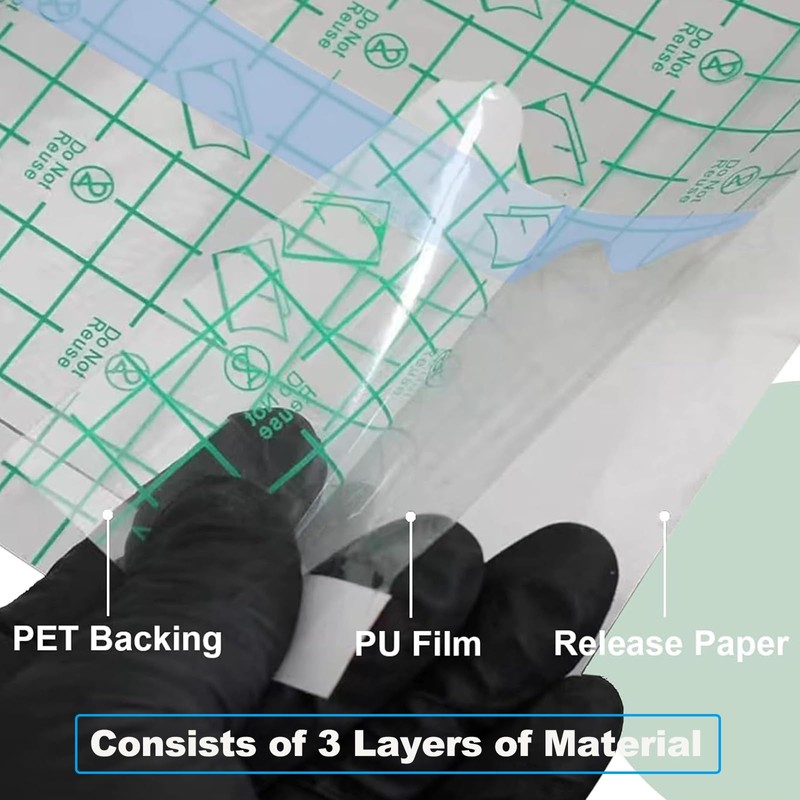 Thickness: Dual-peel design allows more convenient to apply the film to the skin and minimized air bubble and wrinkle formation to have a more effective coverage.