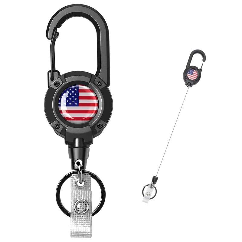 YueMiEcoUS Retractable Keychain Heavy Duty 1 Pack -31.49 inch Extended Dyneema Cord, Quick-Release Badge Holder,Carabiner Clip for Work, Outdoor (American Flag,Black 1)
