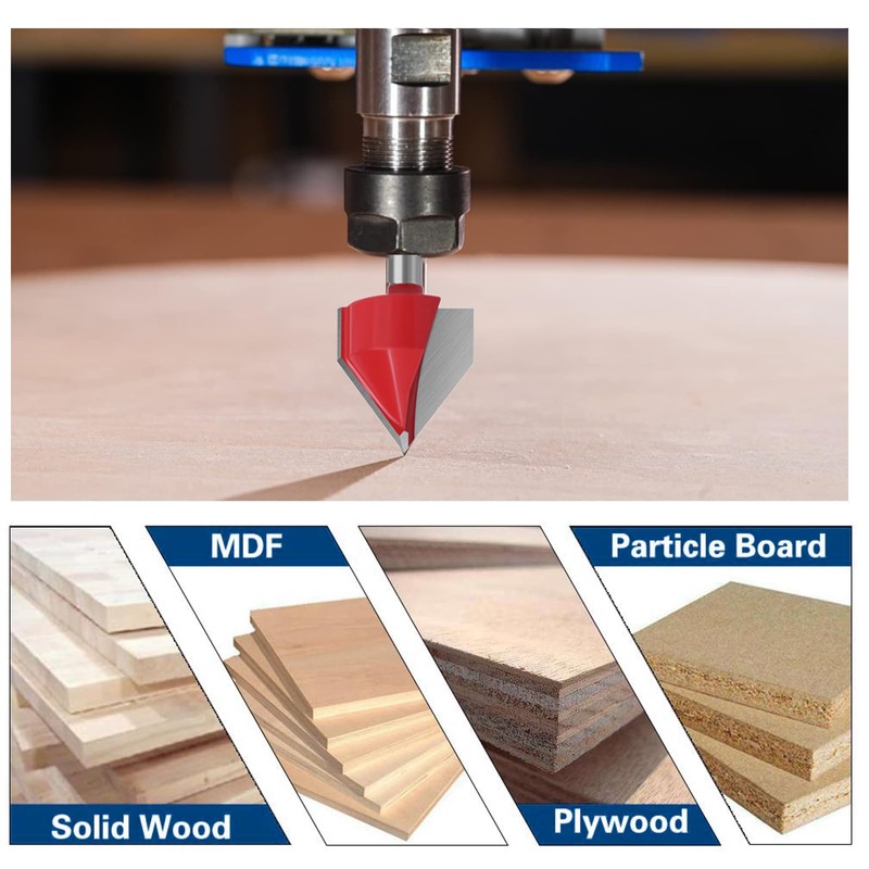 - This router V bit suitable for acrylics and plastics, carbon fiber, chipboard, laminated veneers, MDF, PCB, solid surface, wood and wood composite materials