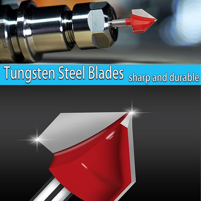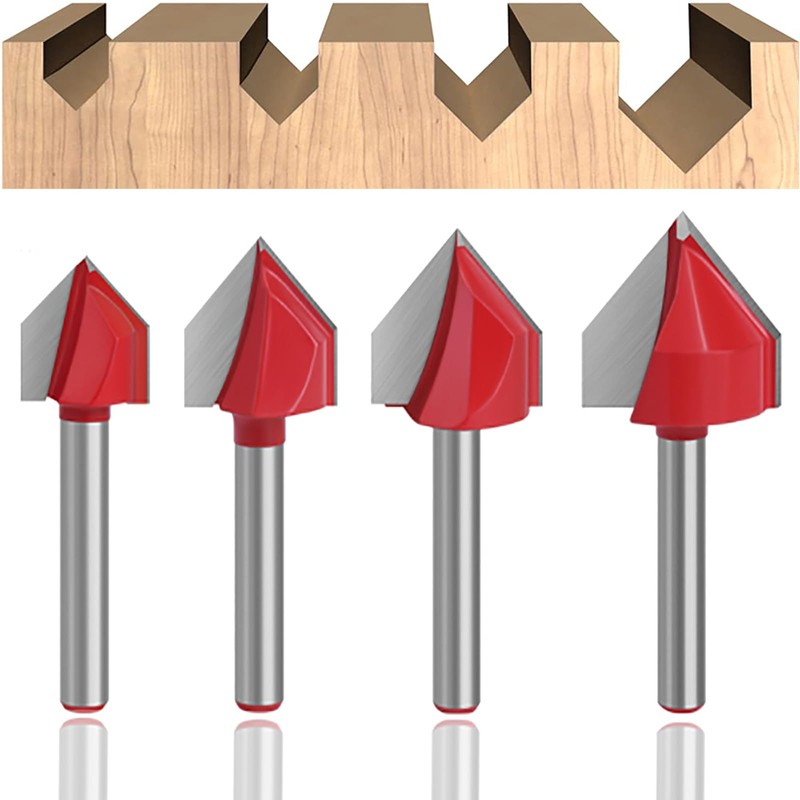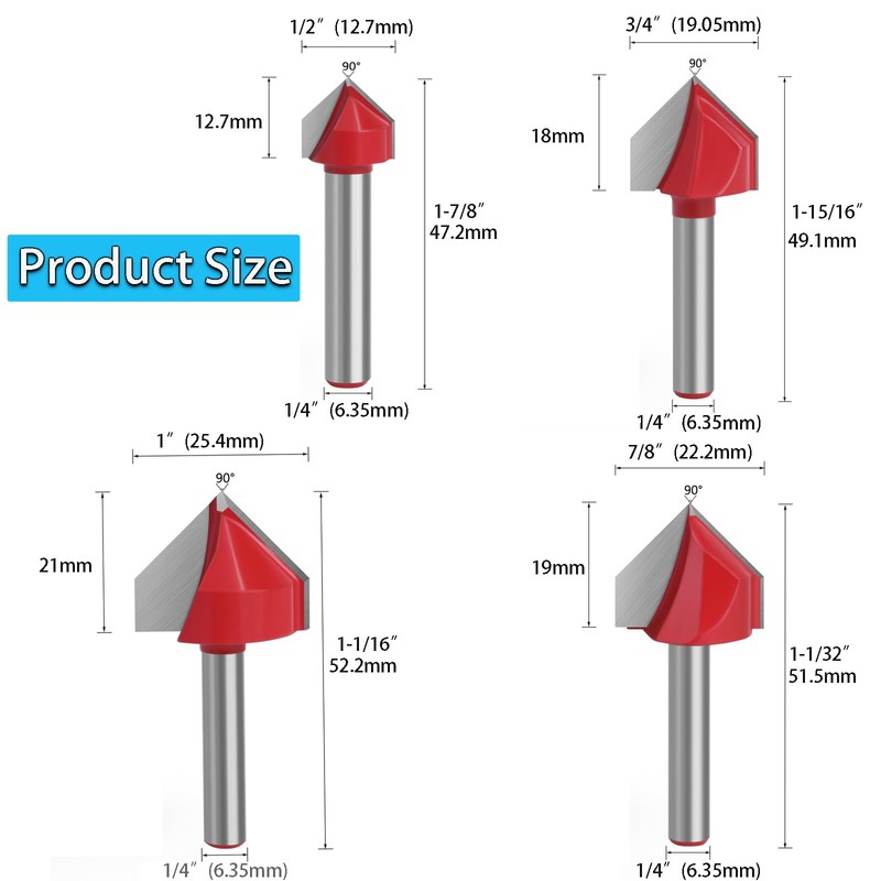 - Shank: 1/4-Inch, Shape: V-Groove, Angle: 90 Degree, Cutting Diameter: 1/2",3/4", 7/8", 1"