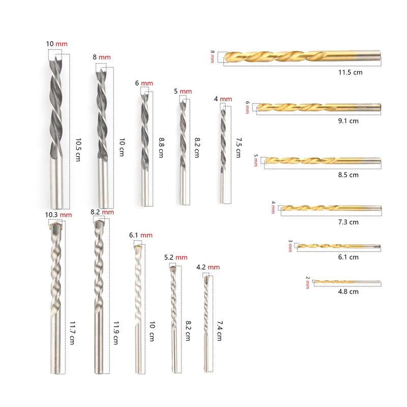 - 3 Kinds and 16Pcs: There are 6pcs twist drill bit(2、3、4、5、6、8mm), 5pcs masonry drill bit (4、5、6、8、10mm)and 5pcs wood drill bit(4、5、6、8、10mm), the different sizes will meet your needs.