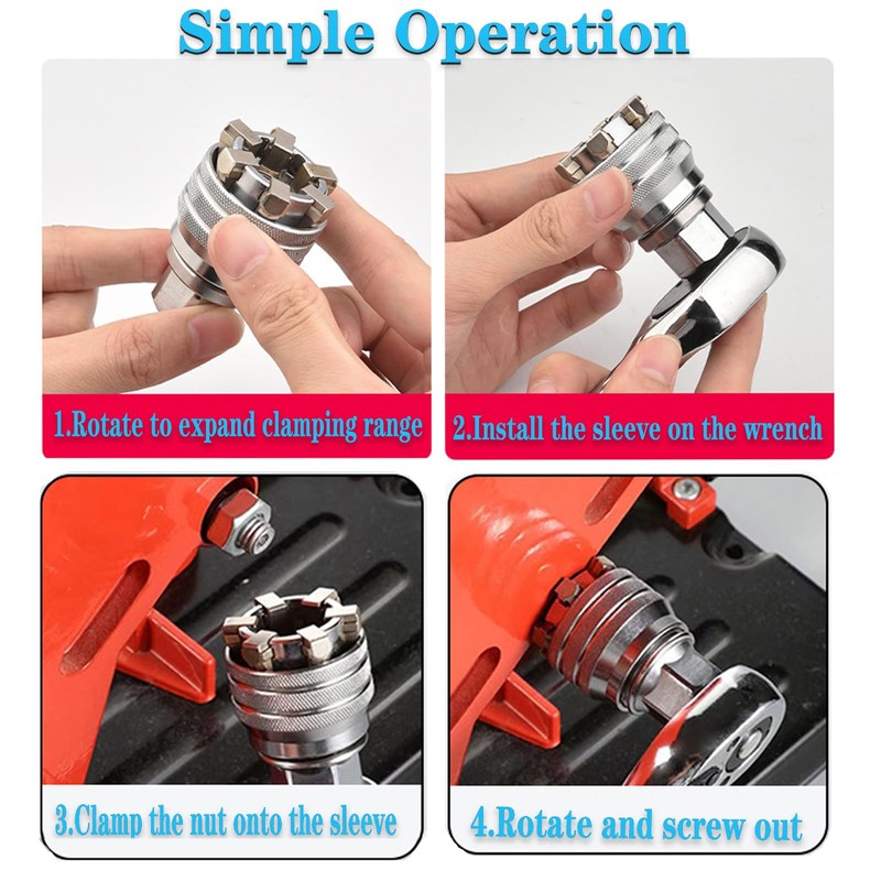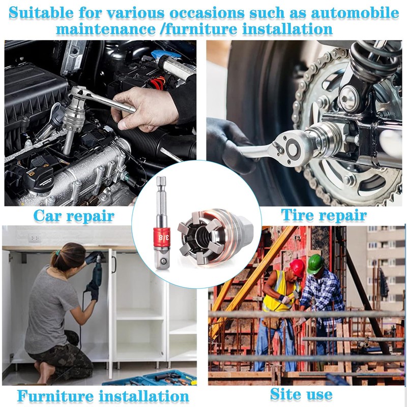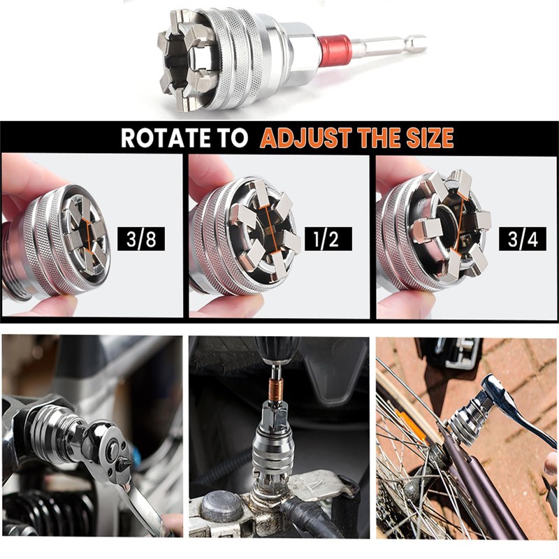 This magic sleeve can be used with ratchet wrench, universal wrench, electric key and electric drill. It allows the wrench to turn nuts of different sizes. Compact and easy to carry.