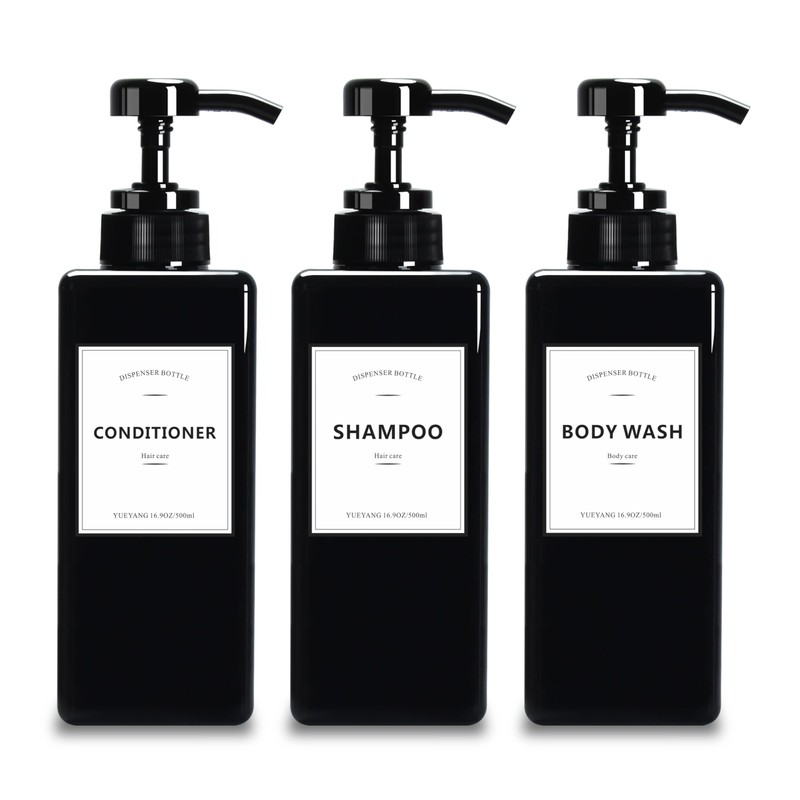 YUEYANG Black Shampoo and Conditioner Bottles, 16.9OZ Pack of 3 Empty Shower Bottles Rerefillable with Labels, Black Shower Dispenser with Pump