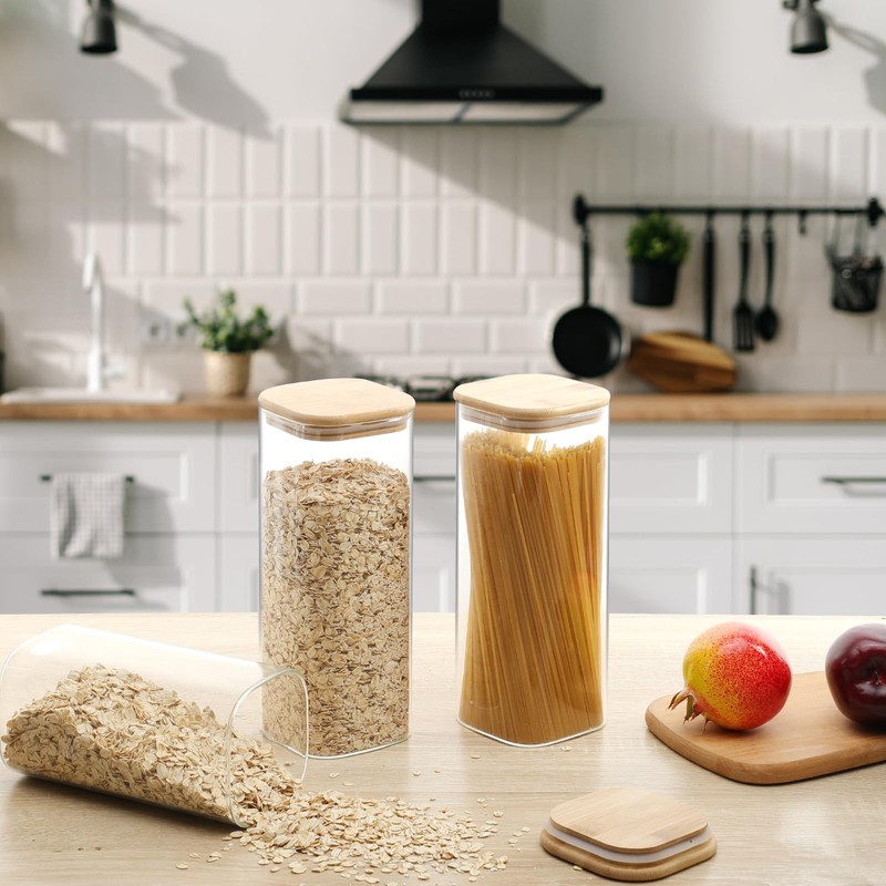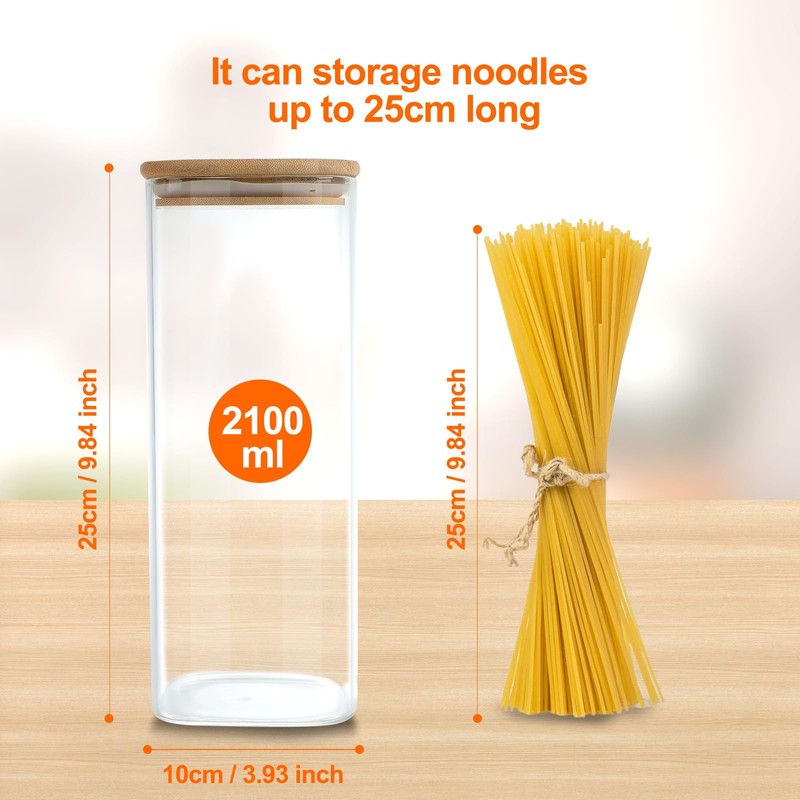 - 【Multiple Capacity Options Glass Storage Jars】:We provide 1600ml,2100ml capacities kitchen storage containers,you can choose according your need.1600 ml is suitable to store pasta, cookies, sweets,beans oatmeal and so on.The large capacity of 2100ml is ideal to storage rice,flour, pasta,spaghetti and noodles.