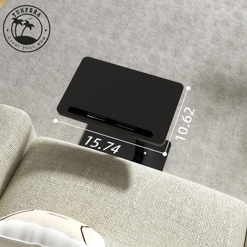 YUHFERA Sofa Armrest Tray Table for Couch - 360° Swivel Height Adjustable End for Small Spaces, Snack Side Table for Bed or Chair with Phone & Tablet Slot (Black)