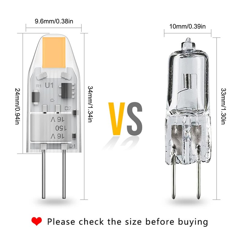 - ✔ Easier to Install: Size: 9.6*34mm. US standard g4 base matches It up. G4 led bulb used for car, RV, landscape bulb, under cabinet lighting, post lights, restaurant, recessed light, hotel, table lamp, courtyard, garden and etc.
