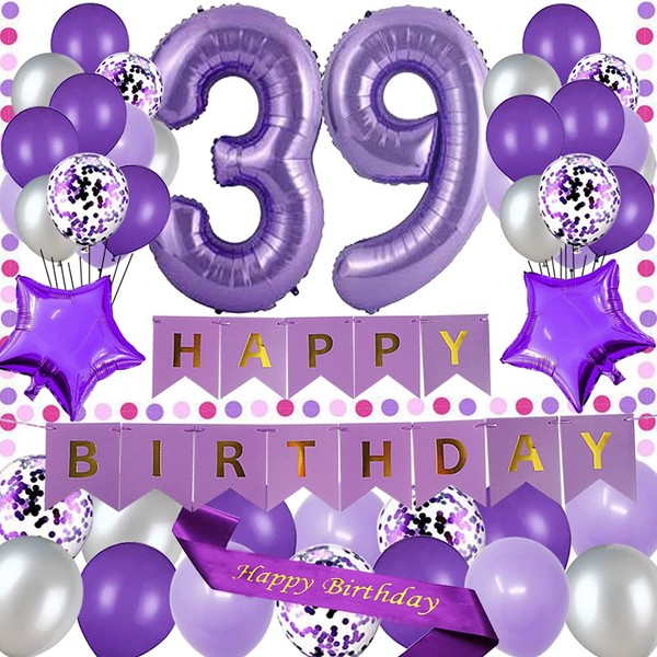 yujiaonly 39th Birthday Party Decorations Purple Happy Birthday Paper Banner Purple 40inch Number 39 Happy birthday Sash Latex and Confetti Balloons Perfect for 39 Years Old Party Supplies Balloons Number 39 Purple