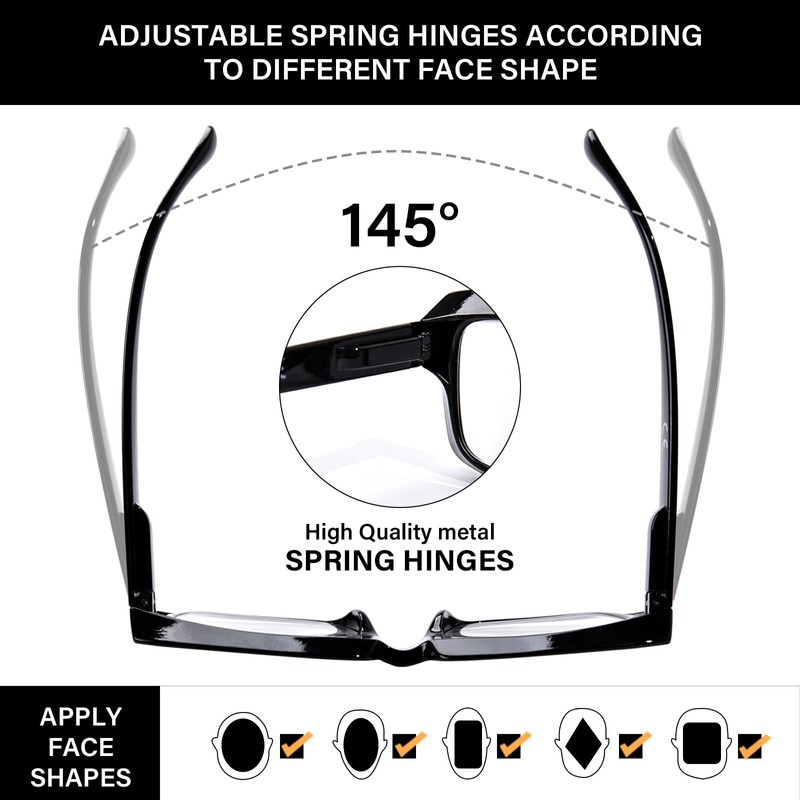 - 【FLEXIBLE SPRING HINGE】: Adjustable spring legs find the best fit for different face whether is oversized, petite or medium, it will easily solve your problems. The arbitrarily swingable spring leg design also reduces the squeezing of the glasses to the head; Good protection for your eyes and head.
