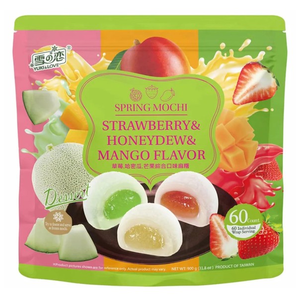 YUKI LOVE Spring Mochi Dessert, Strawberry, Honeydew & Mango Flavors, 60 Count, 31.8 oz