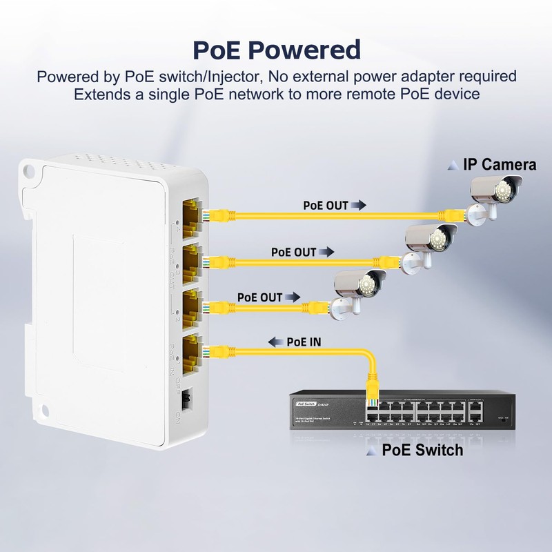 - Unmanaged PoE Repeater: The gigabit passthrough PoE switch supports automatic detection of devices, no setup is required, no need for additional power adapter, powered by POE network, just need a network cable to expand PoE network, plug and play.