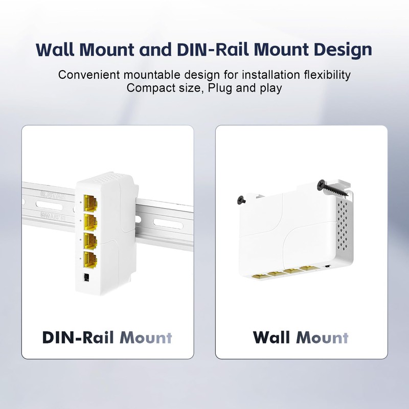 - Flexible Installation: With its mini size, YuLinca gigabit PoE extender is supported wall mount and din rail mount, space saving, suitable for more positions.