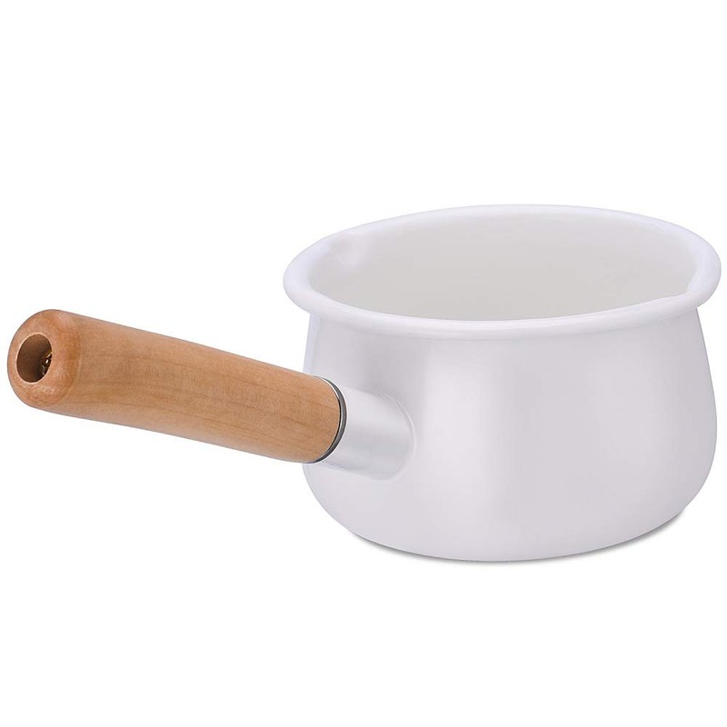 YumCute Home Enamel Milk Pan with Dual Pour Spout Butter Warmer Milk Pot for Stove Top Healthy White Enameled Inside Coating Iron 1QT Small Soup Pot with Wooden Handle Handy Pot (White)