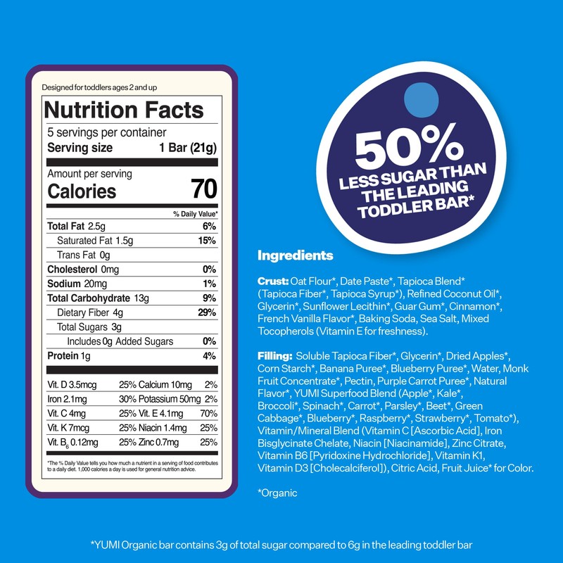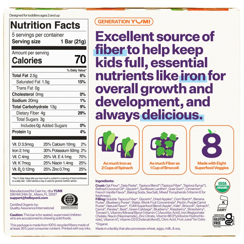 - DESIGNED FOR DEVELOPMENT: Aligned with your child’s nutritional needs, YUMI award-winning bars are an excellent source of fiber and packed with at least 8 essential nutrients and 7+ superfood vegetables. Intelligently designed to address the most common nutrient deficiences of US toddlers and kids.