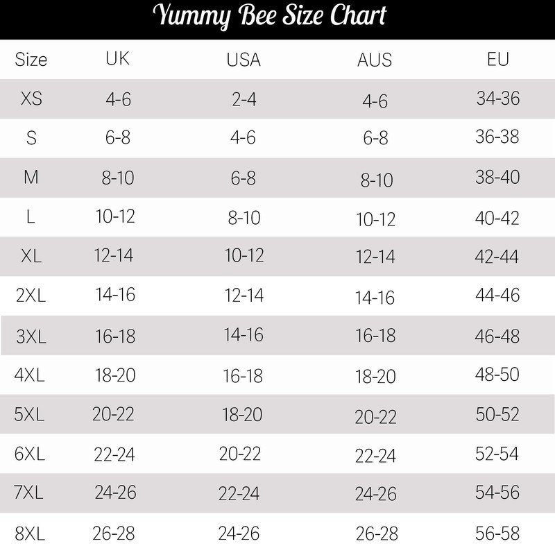 - Beauty for all sizes - Available in sizes 36-54. See the Yummy Bee size chart image.