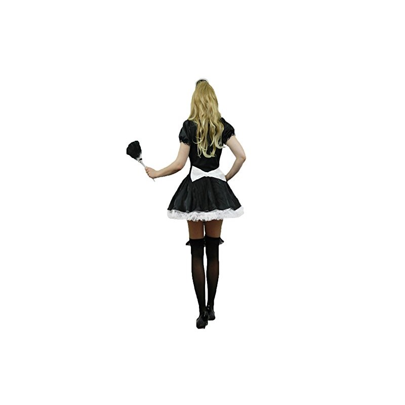 - Dazzling french maid costume, black stretch dress with fitted apron and lace trim. Also includes solid black hat and real feather duster - see image.
