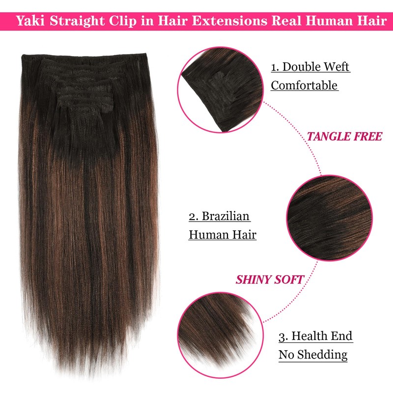 - 【Yaki Straight Clip in Hair Extensions Real Human Hair】:100% remy human hair extensions, the hair is carefully selected and processed to ensure that it is soft, shiny, and tangle-free. Is built to withstand daily wear and tear. With proper care and maintenance, a set of clip hair extensions can last for months, making it a cost-effective investment in your beauty routine.