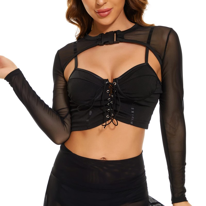 Yunison See Through Mesh Crop Top with Buckle for Women, Long Sleeve Rave Tops Open Front Shrug Fishner Shirt Buckle Bodysuit for Halloween Nightclub Party