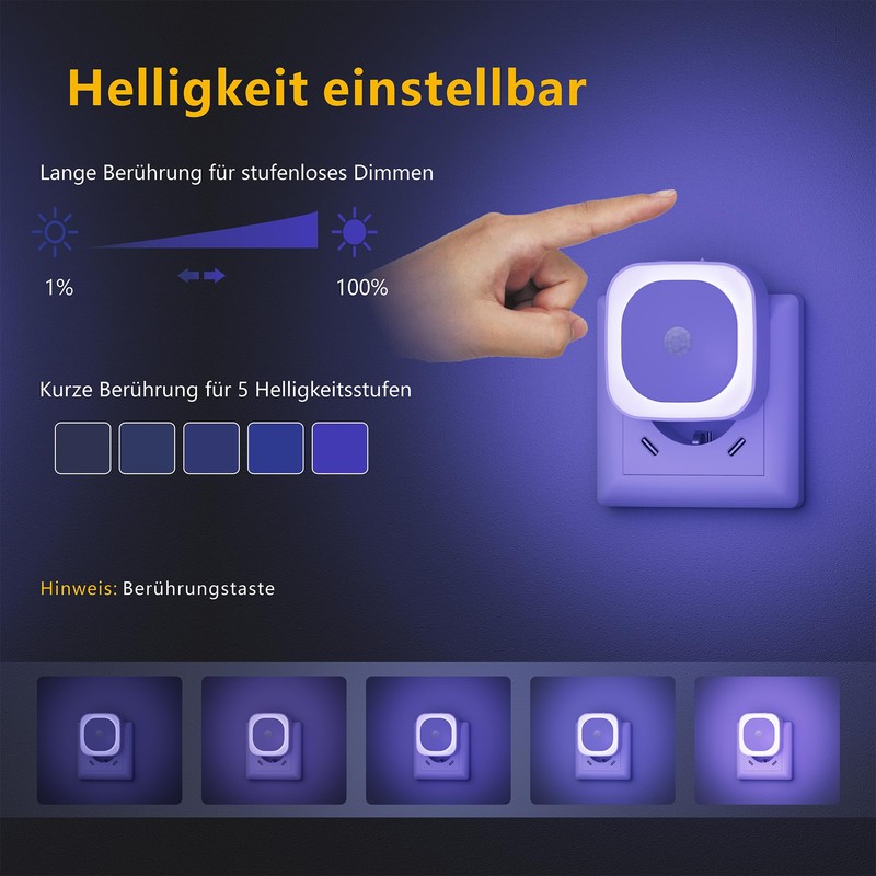 - ??2 Methoden f??r einstellbares Licht??: Dieses Nachtlicht kann kurzber??hrt werden f??r 5-stufiges Dimmen und lang-ber??hrt f??r stufenloses Dimmen innerhalb. Ob Sie hohe Helligkeit oder schwaches Licht ben?tigen, es wird Ihnen gut dienen. Wenn die Stromversorgung angeschlossen bleibt, beh?lt das dimmbare Nachtlicht die letzte Helligkeitseinstellung bei, sodass die Helligkeit nicht jedes Mal neu justiert werden muss.