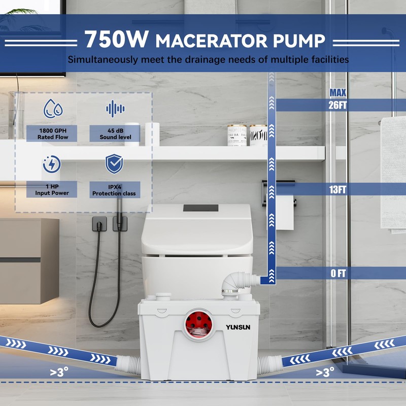 - 750W Macerator Pump: YUNSUN With a powerful 750W motor/0.7HP input power, this pump can pump sewage up to 26FT vertically and 260FT horizontally 1800GPH flow rate.. The high power boosts pumping efficiency, ensuring quick and effective drainage regardless of your space layout.