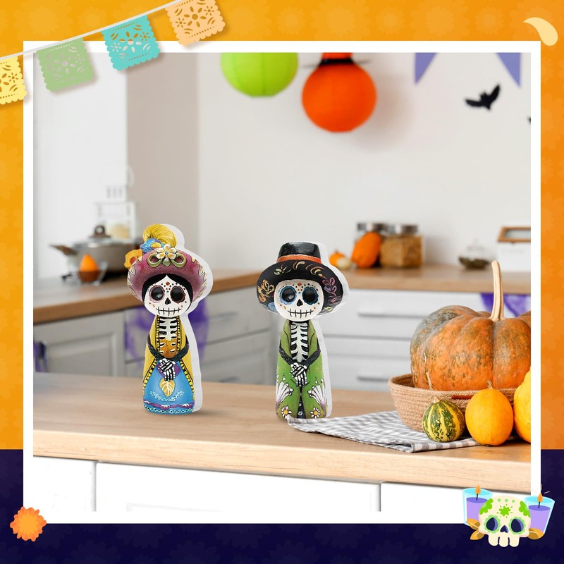 - Day of the Dead Sugar Skulls Statues Set: you will receive 2 pcs Halloween Day of the Dead Sugar Skulls couple figurines designed as a pair of figures dressed in ornate costumes, hats, and elaborate makeup, enough to enhance your Halloween decorations