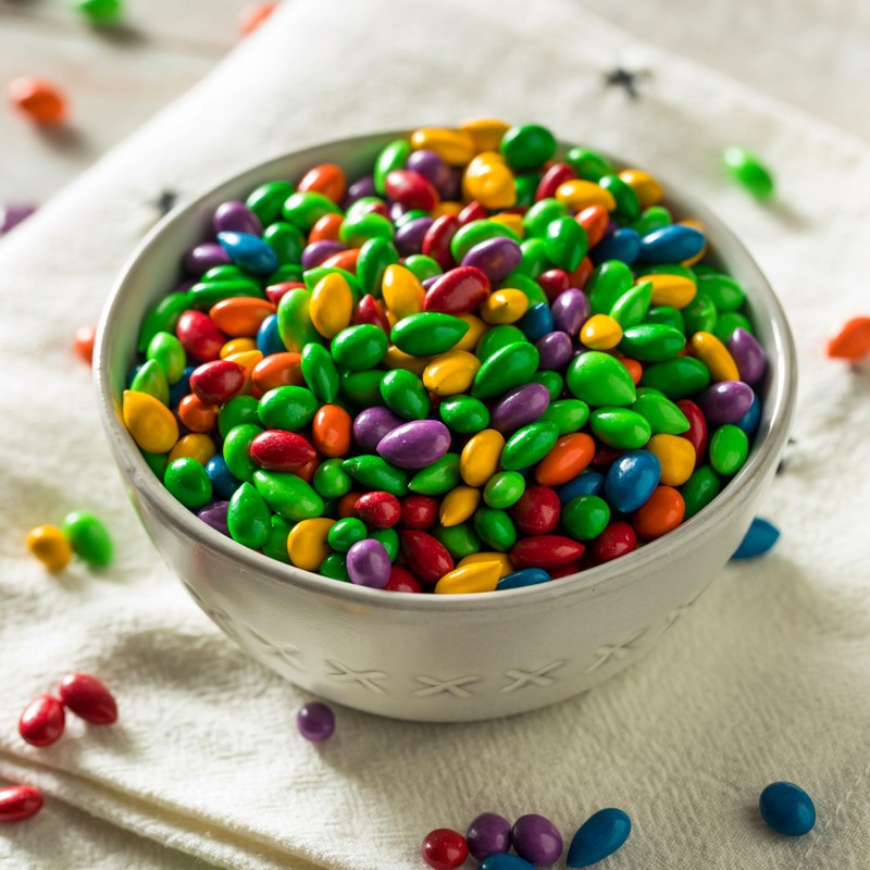 - Whole sunflower seeds covered in chocolate flavored coating and colorful candy
