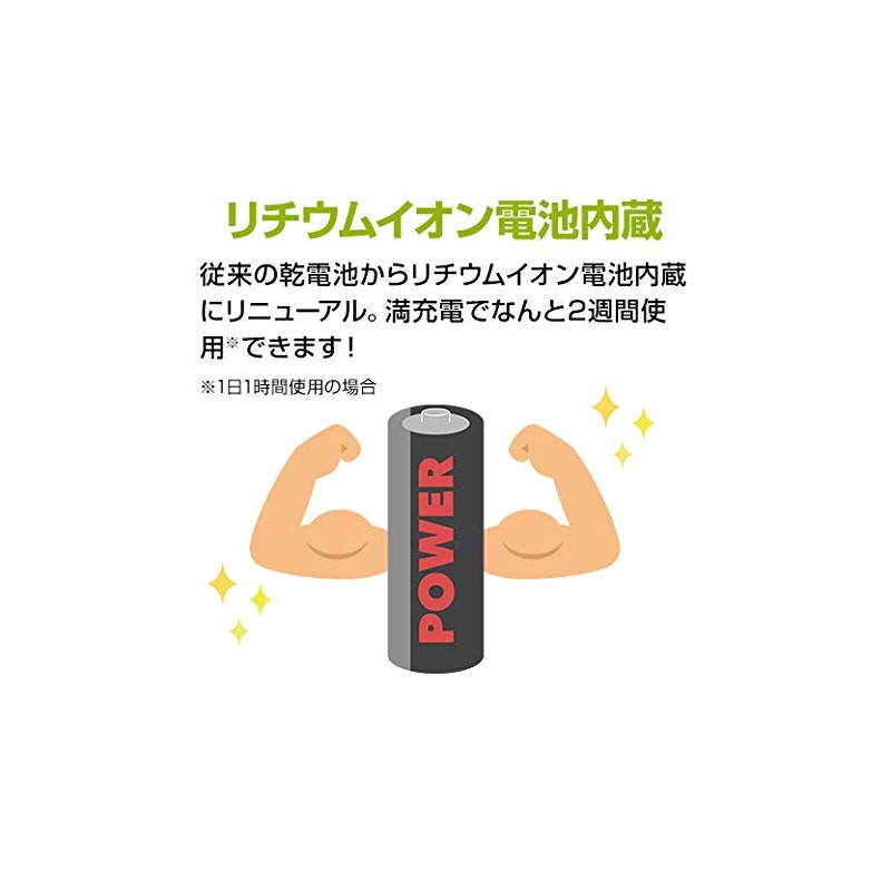 - Continuous usage : If used for one hour per day, approx. 2 weeks. Lithium ion battery.