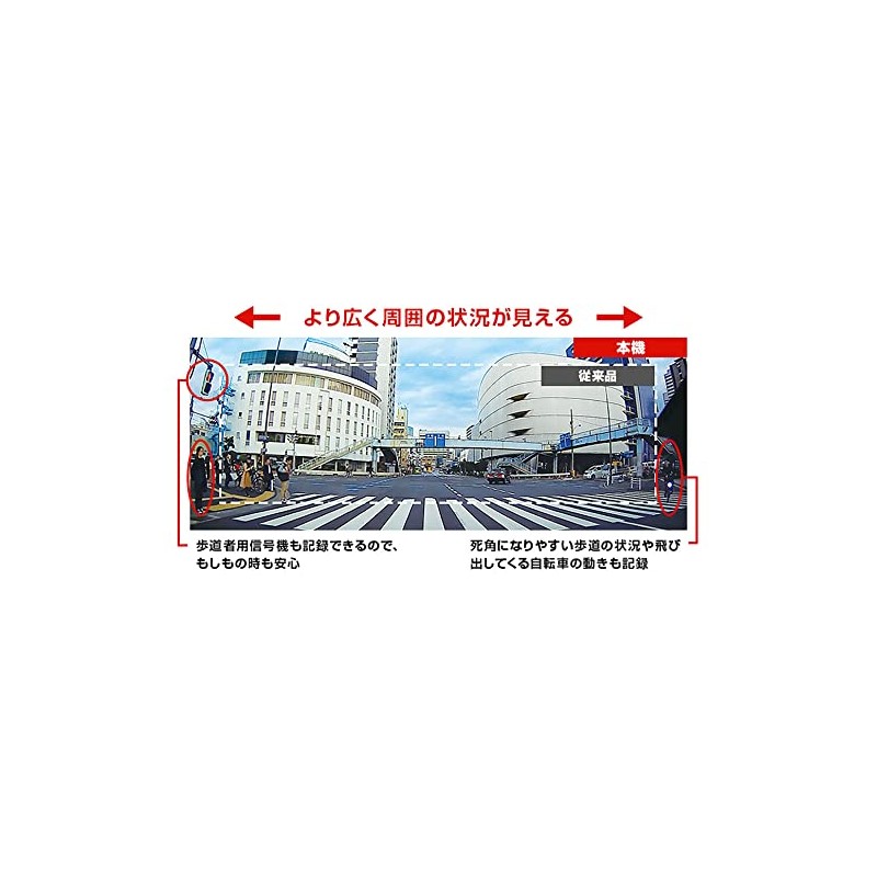 フロント、リアの2カメラで車両の前後を200万画素FULL HD高画質で記録。映像が鮮明なので安心です。さらに、超広角レンズを採用。視野角が広いと、飛び出す人や、自転車、割り込んでくる車両などを捉えることができ、もしもの時もさらに安心。撮影範囲を広くカバーします。