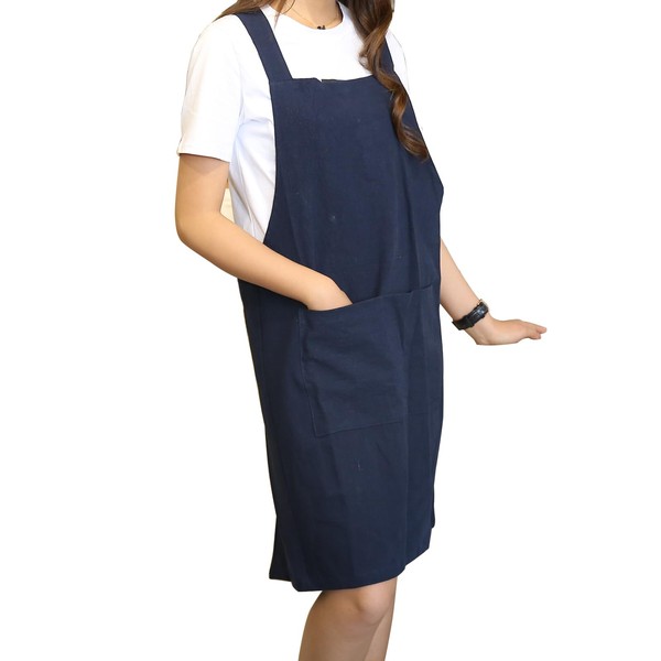 YushengTai Japanese Style Aprons, Minimalist Cotton Linen Aprons with Pockets, Aprons with X-shaped Dummies, Ideal for Cooking and Barbecuing, Gardening, Relaxing and More, Navy Blue-Style-02