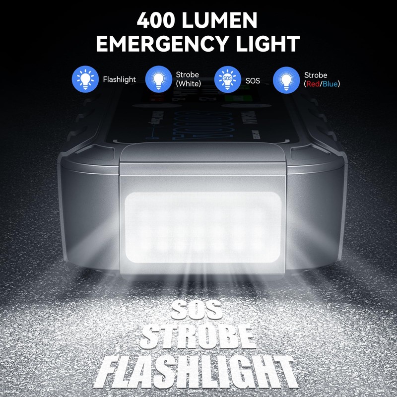 - MULTI-FUNCTION LIGHTING & IP65 PROTECTION: This portable car jump starter is highly functional. It features four lighting modes, meeting various emergency lighting needs. With a continuous illumination duration of up to 96 hours, it serves well in different situations. Moreover, it can act as a warning triangle and can function as your essential emergency device. Thanks to its IP65 protection rating, it can resist harsh environments such as rain and dust, ensuring the product's durability and reliability, and enabling it to operate stably anytime and anywhere.