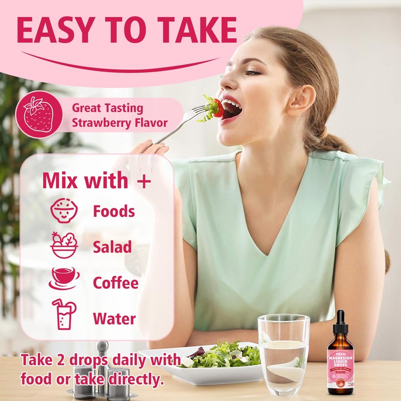 - DIRECTIONS FOR USE: Conveniently take 2 ml directly by mouth or add it to water, drinks or your favorite foods. Our strawberry magnesium drops for adults turns your daily magnesium supplement intake into a pleasant treat. No more chalky or messy scoops, no more hard to swallow.