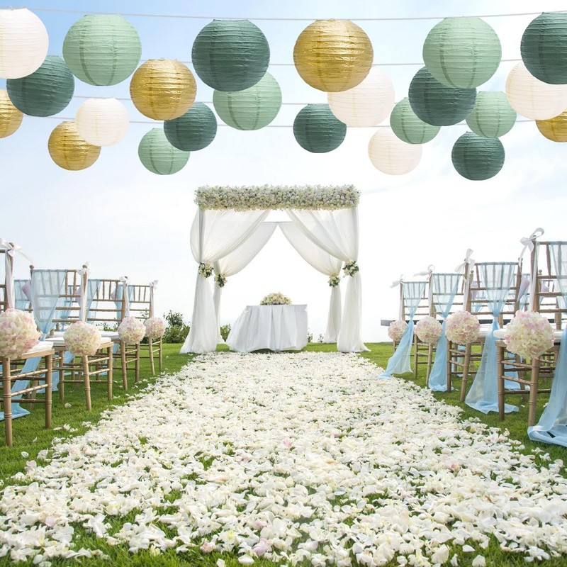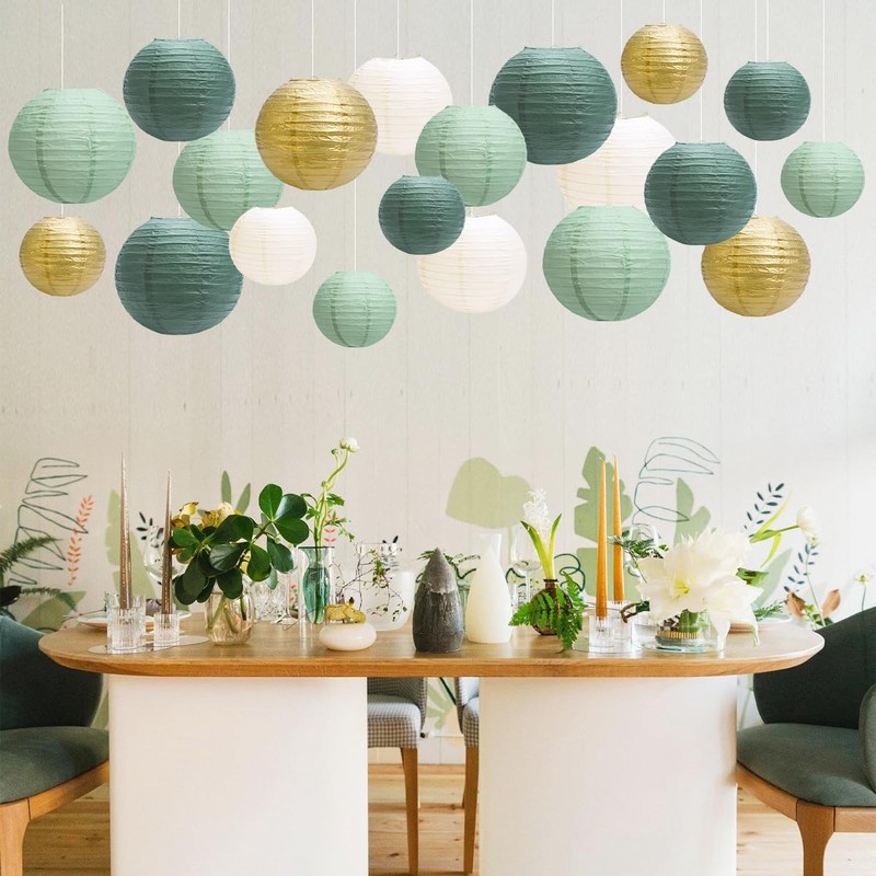 - Package contains: The paper lantern kit contains with 20 pieces of sage green forest green ivory and gold paper lanterns, including 6 x 10 inch lanterns, 7 x 8 inch lanterns and 7 x 6 inch lanterns. These green paper lanterns will provide a variety of backdrops for themed weddings and parties.