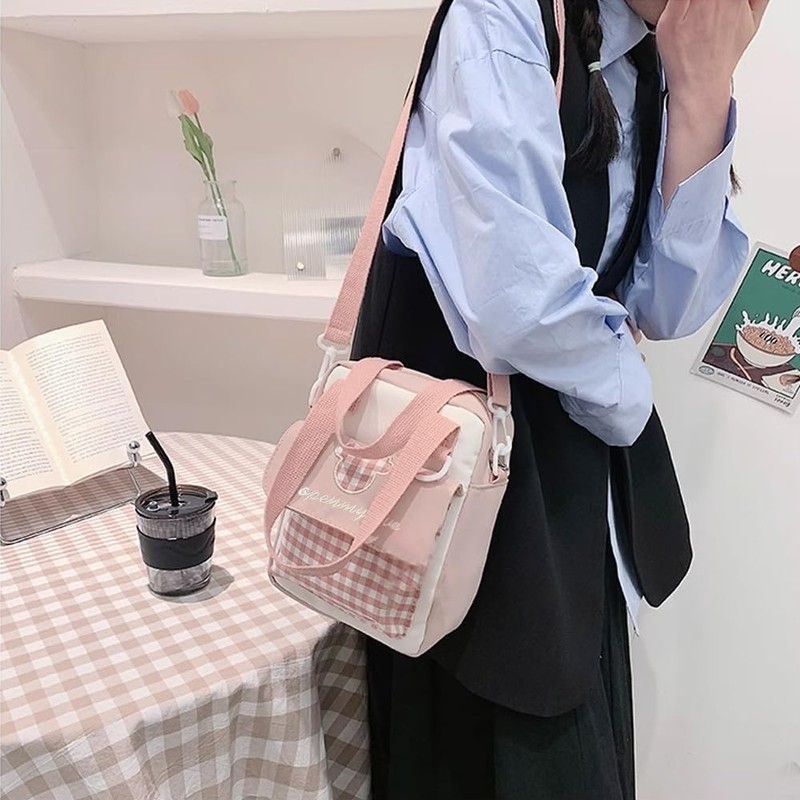 YUYAKESHI Bag, Showing Off Bag, Shoulder Bag, Pushing Activity, Cute, Stuffed Animals, 3-Way Outing, Pocket with Lid, One Side Transparent, Checkered Pattern, 6.7 x 9.1 x 3.1 inches (17 x 23 x 8 cm)