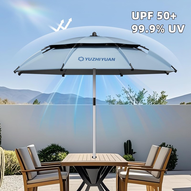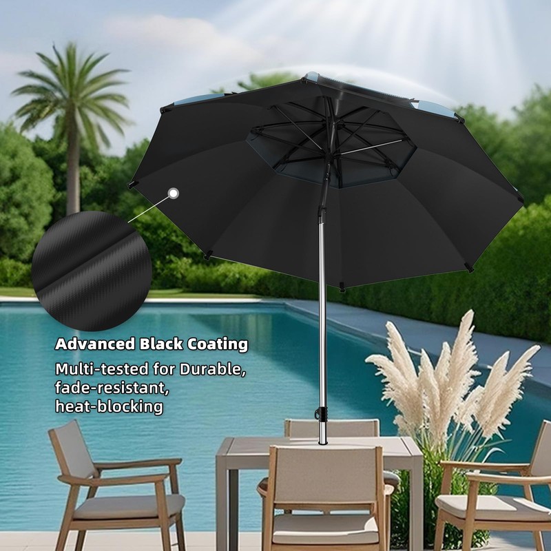 - Patio Table Umbrella features a dual-layer canopy that promotes excellent air circulation, keeping you cool and comfortable even in the shade on hot sunny days. Reinforced with 8 durable fiberglass ribs, it offers outstanding wind, pressure, and heavy rain resistance—ensuring peace of mind in any outdoor setting.