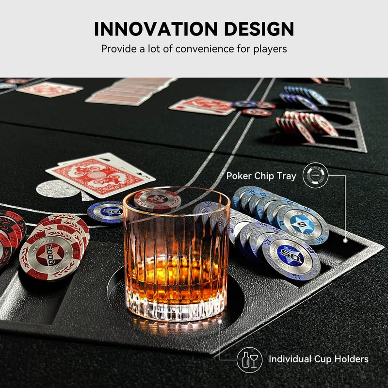 - [Embedded Chip Trays and Cup Holders Design Poker Table] NOTE: poker chips not included. Poker table top added individual cup holders and chip trays at each location for players to place their personal items at will. The design layout of the simulated casino table top makes you feel like in a Las Vegas casino, enhancing the game experience for your friends and family.