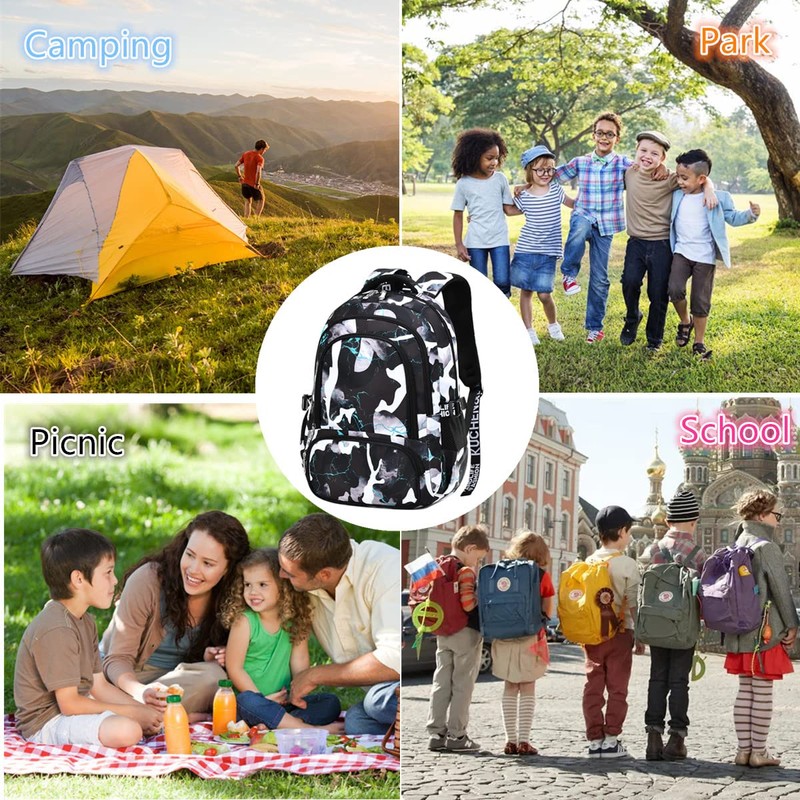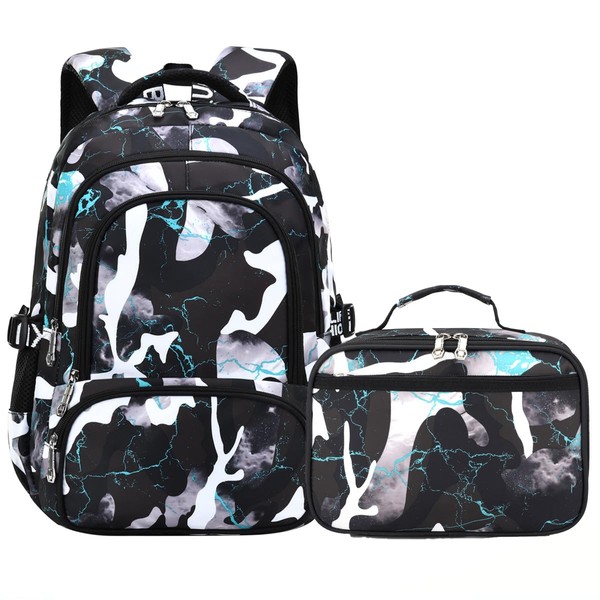 Yvechus Camo Backpack for Kids, Lightweight Camo Backpack Elementary Middle School Backpack Water Repellent Bookbag (Camo Black Green 2 in 1)