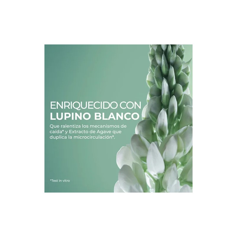 Enriquecido con Lupino Blanco: reduce la caída, estimula el crecimiento del cabello existente y fortalece el cabello que pierde vitalidad.