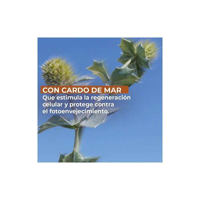 Protector Solar en Leche FPS 50; enriquecido con Cardo de Mar por su capacidad de proteger contra el fotoenvejecimiento. Este producto protege eficazmente la piel contra los rayos UVA/UVB y las quemaduras solares. Inmediatamente hidratada, la piel queda flexible, suave y ligeramente perfumada.