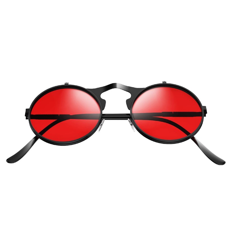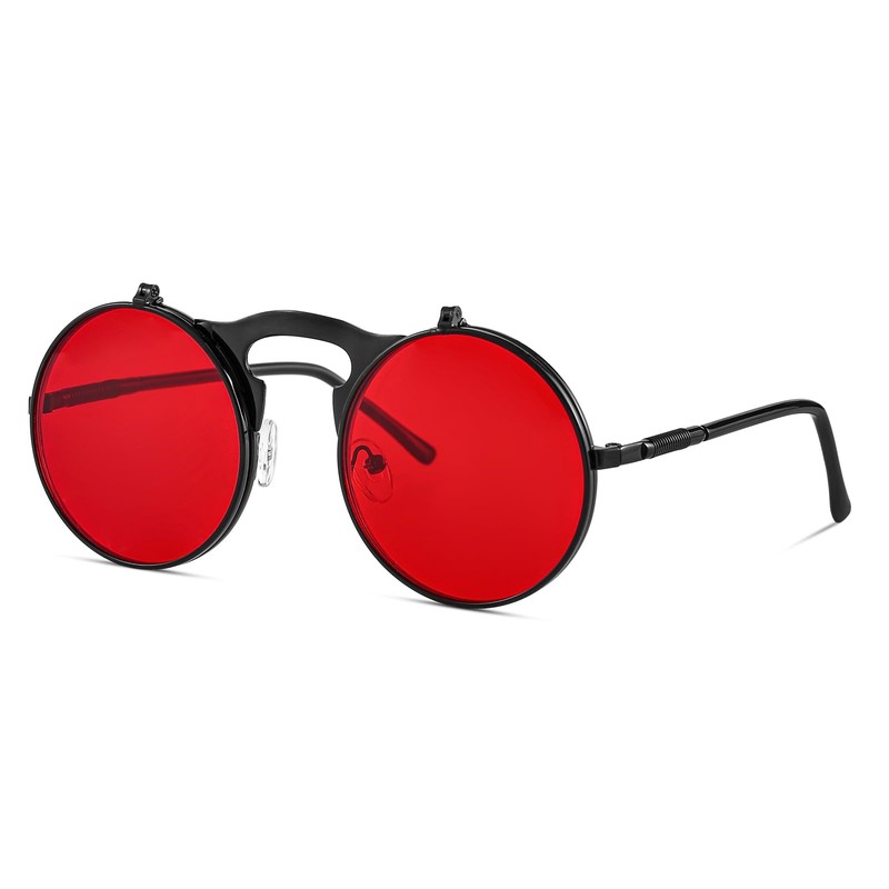 Yvey Essence Unisex Retro 80s/90s Flip-Up Round Sunglasses Steampunk Rave Shades with Double Lenses (Black Frame/Red Lens)