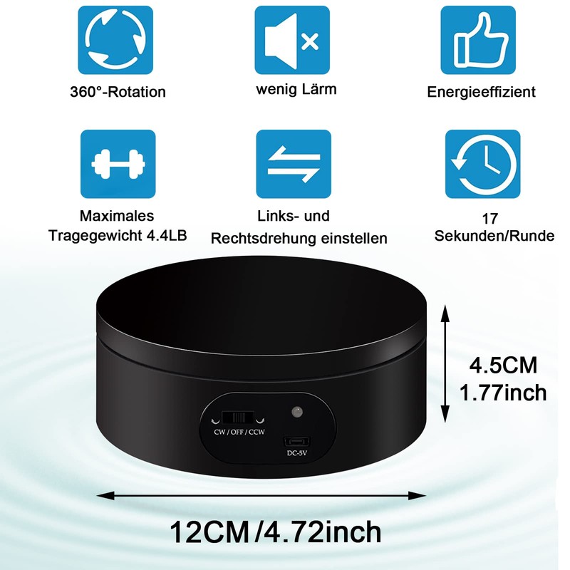 YVVV Electric Rotating Turntable,rotating display stand for Video Shooting,Display Jewelry,Anime Figures,Watch-12cm/4.72 Inch, Motorized Turntable 360º Rotating for Product Display Black