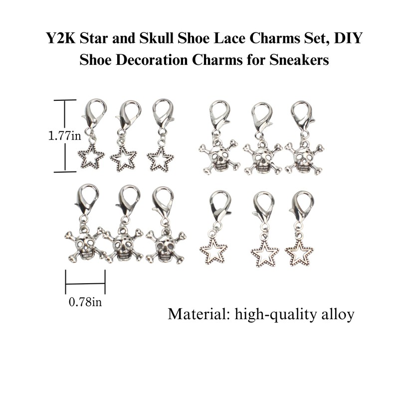 Each pack includes 12PCS of high-quality alloy charms in silver tones, ensuring long-lasting shine without tarnishing. Lightweight yet durable, they easily clip onto shoelaces or attach to fabric without damaging your shoes. Express your Y2K aesthetic and make every step stylish!