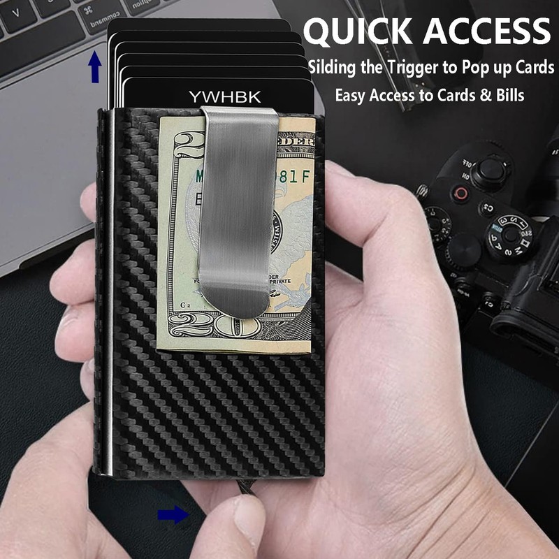 YWHBK Card Holder, Men Credit Card Holder, Slim Card Case Front Pocket Anti-theft-RFID Auto Pop up Travel Thin Wallets for Men, Black Carbon Fiber Leather With Stronger Metal Money Clip, small, Slim