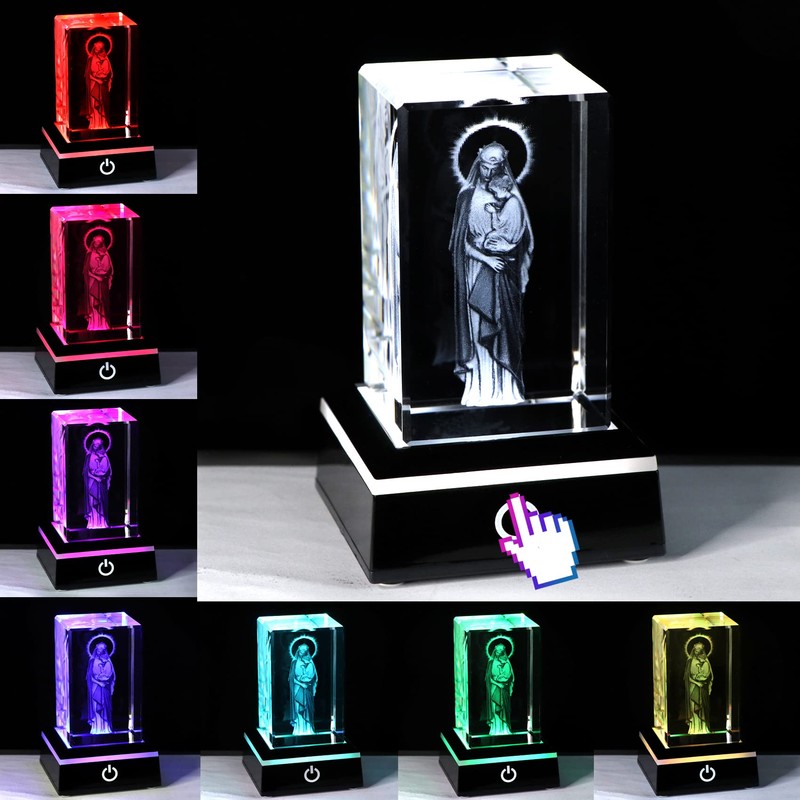 YWHL - Estatuas de vidrio 3D de la Virgen María y el Bebé Jesús con base LED colorida grabada con láser, figura de Jesús bendita madre e niño, regalos religiosos, decoración de recuerdos para amigos