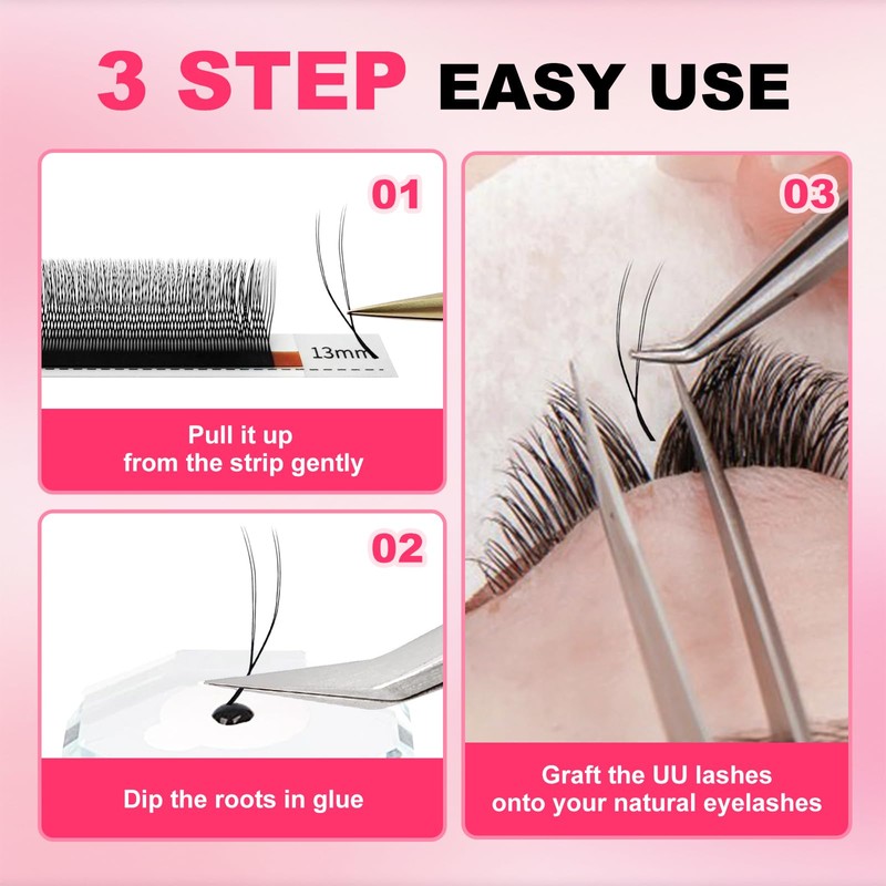 - 【Eyelash Specifications】: The U lash extensions are made of the high quality black PBT silk material, light and soft. 0.07 thickness, C/D curl, mixed 8-15mm. 12 rows per lashes tray.